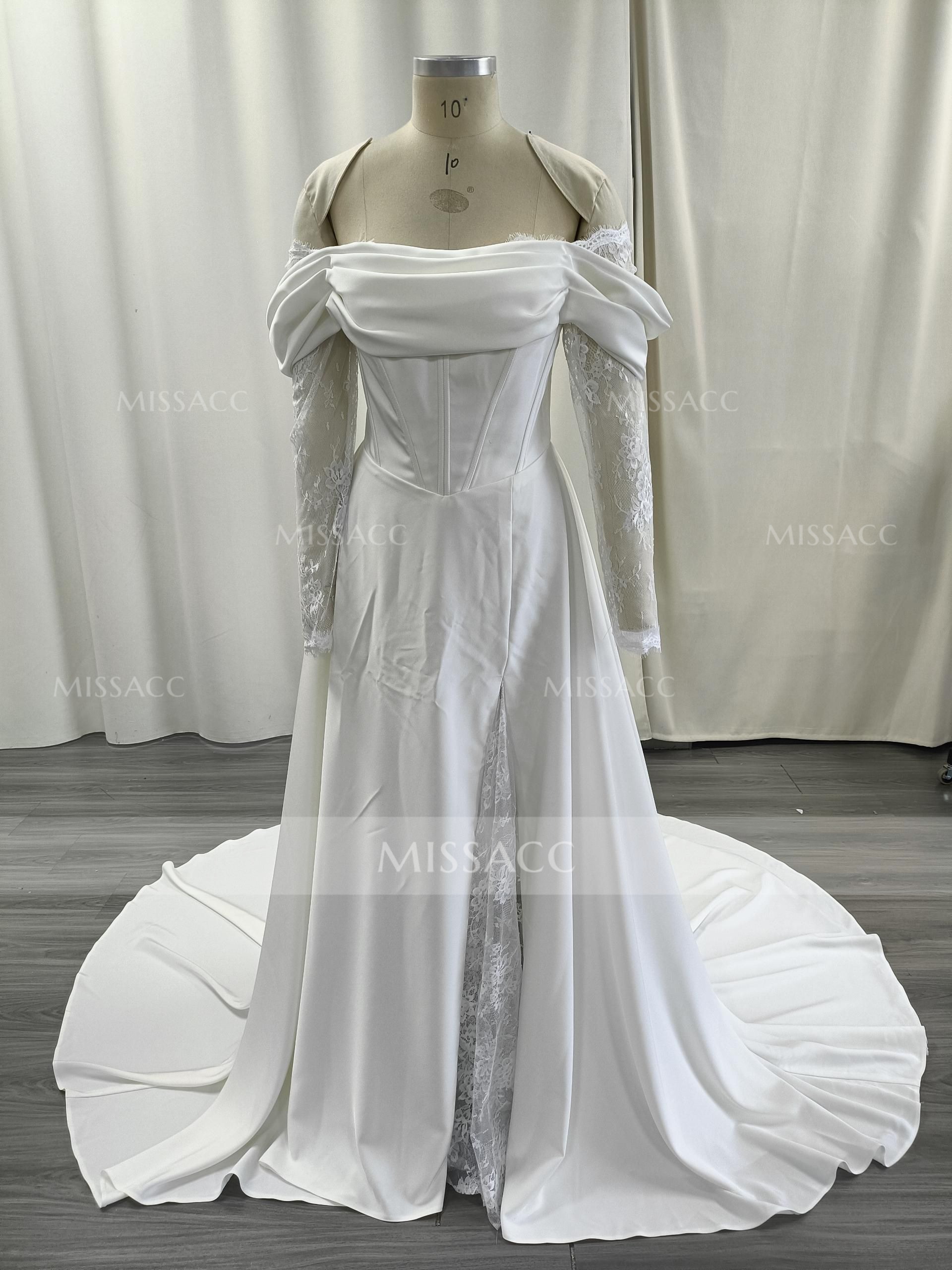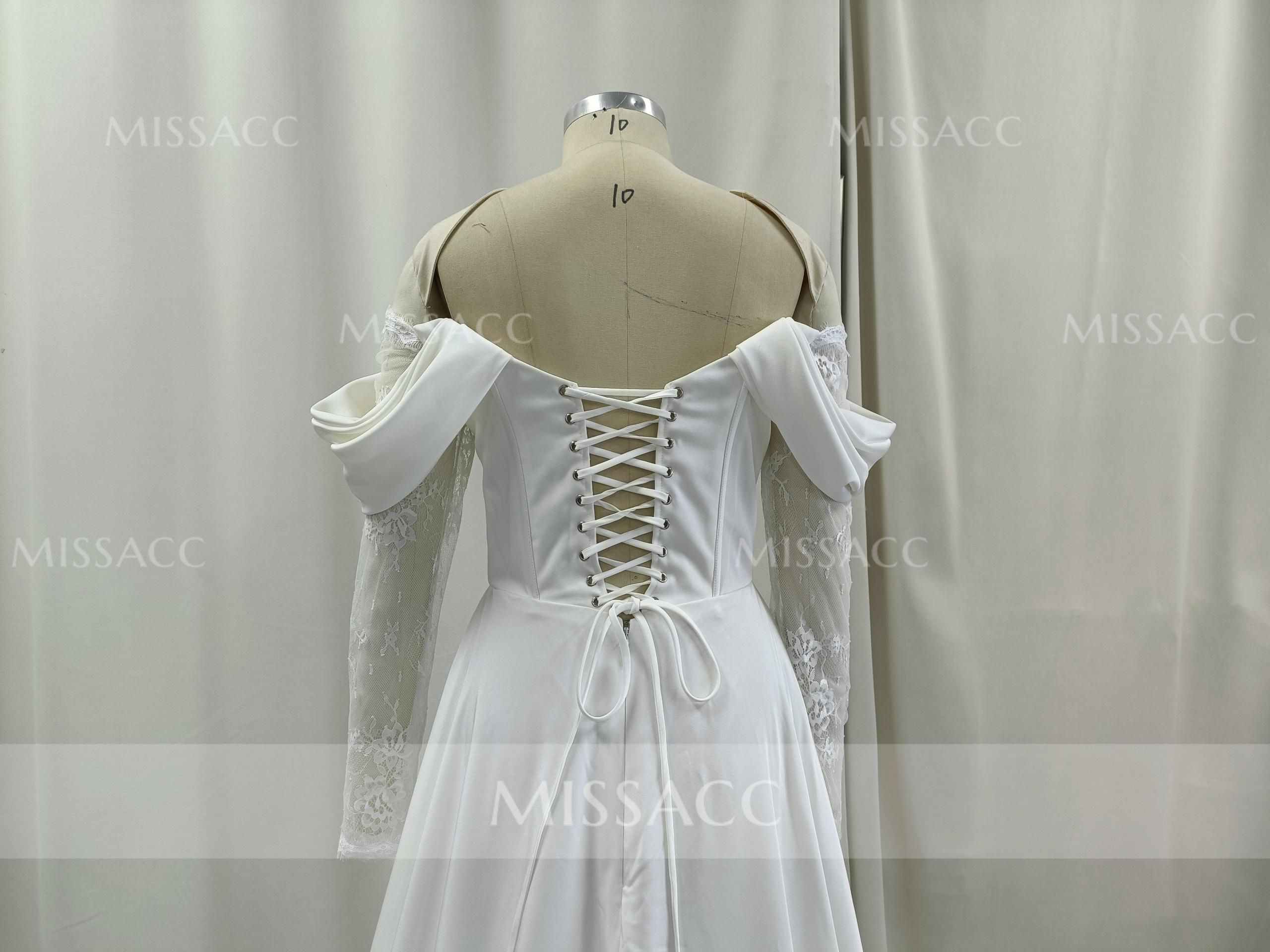 A-Line Off-The-Shoulder Long Sleeves Court Train Lace Wedding Dresses With Split Front #SWD13129