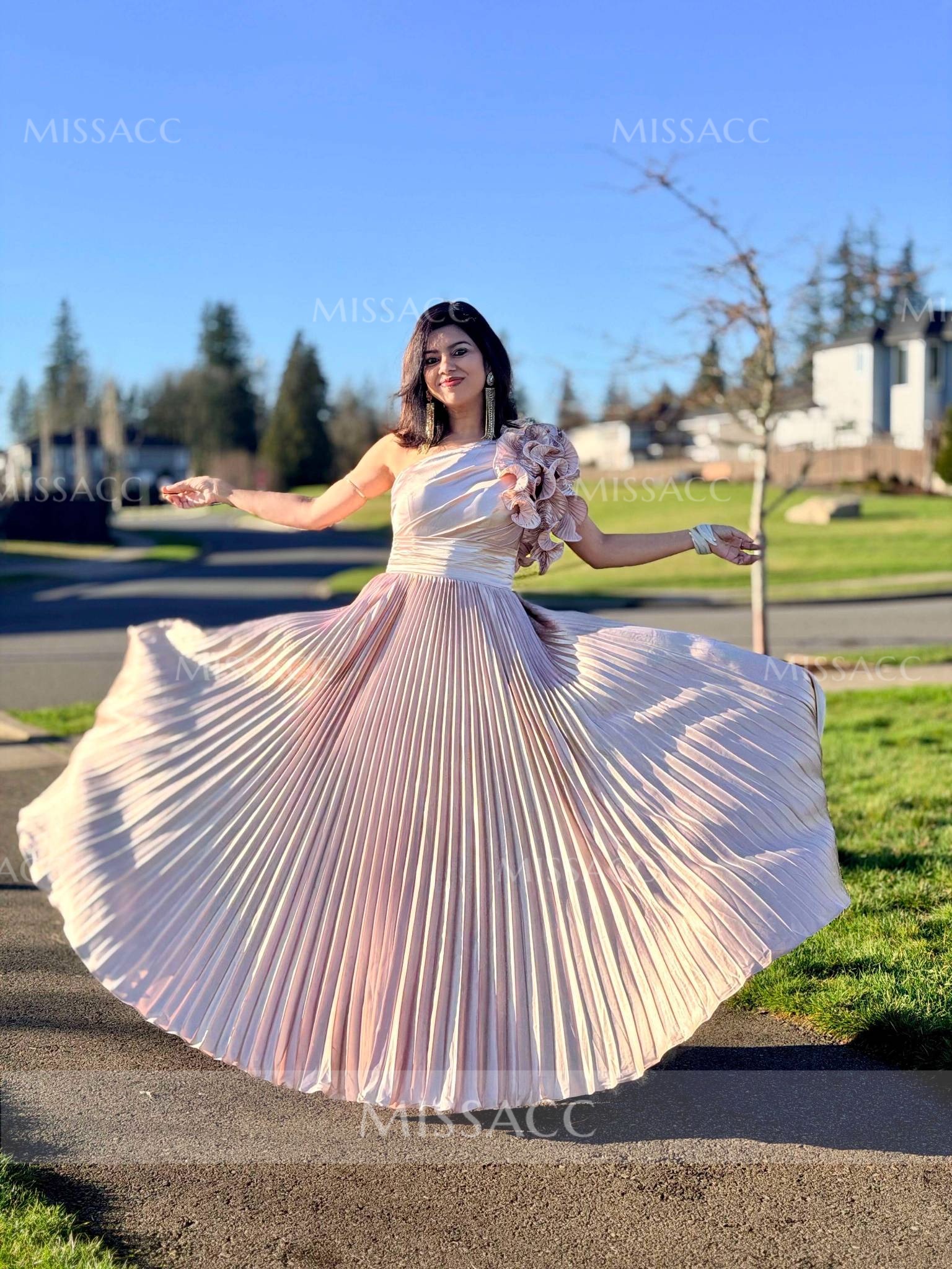 The dress arrived quickly and it's really well made. My mom loves the one-shoulder design, it's elegant and unique. The ruffle adds a nice touch of flair. Just a heads-up, it runs a bit large, so we had to get it altered, but other than that, no complaints!