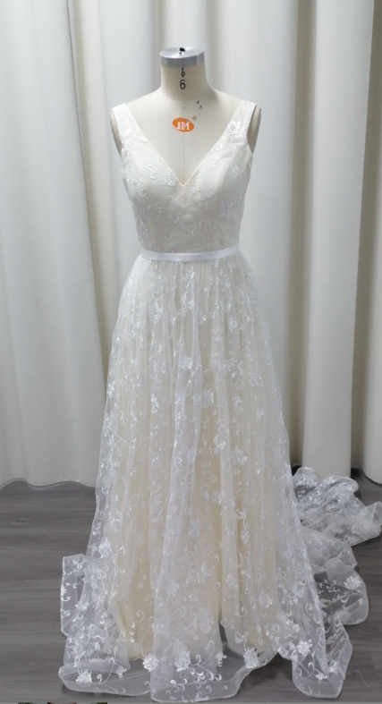 I'm delighted with this purchase! The dress is incredibly pretty and fits perfectly. The v-neck design is flattering and the tulle and lace combination is dreamy.