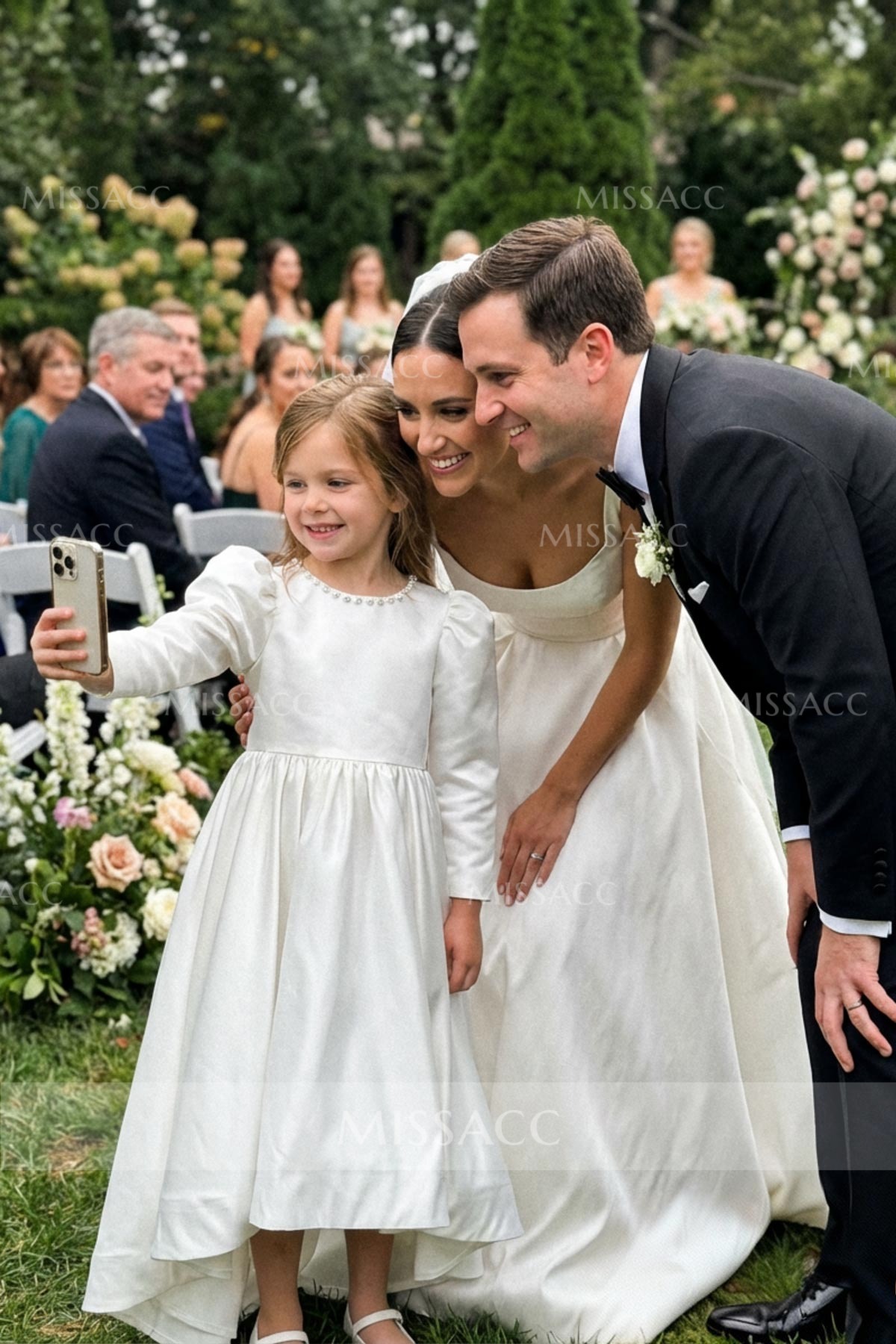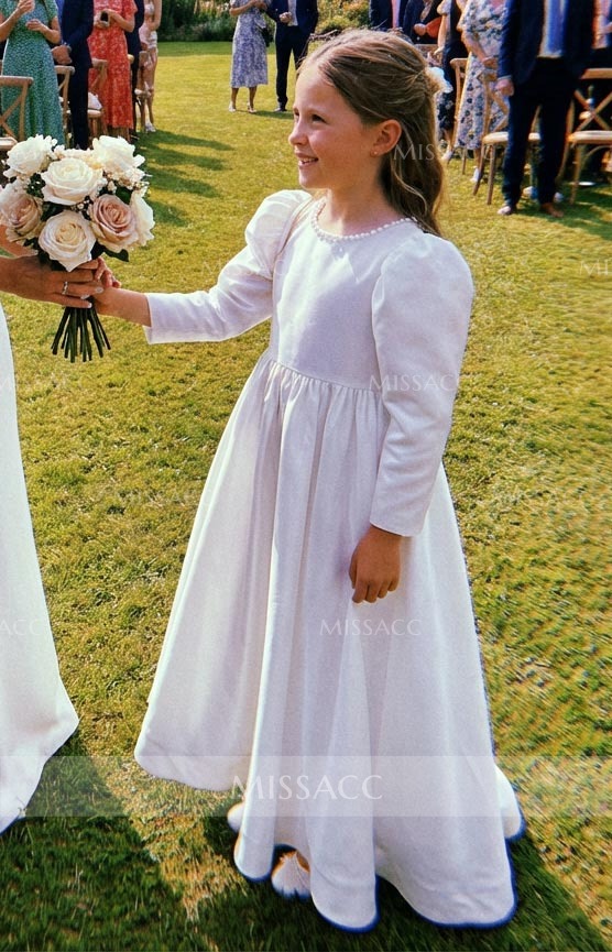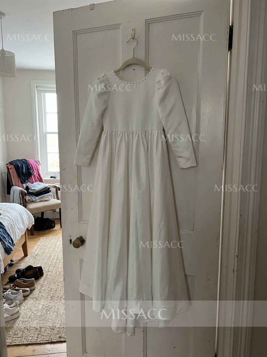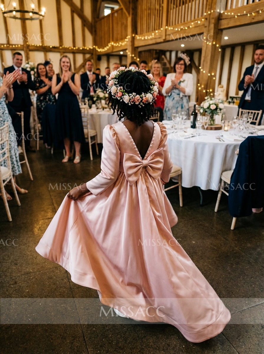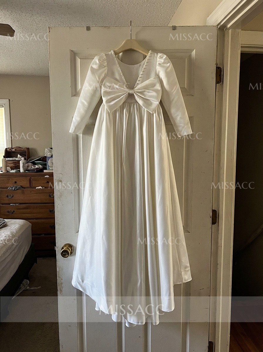 Discover our A-line satin flower girl dress with a scoop neck and 3/4 sleeves, featuring a sweeping train and elegant bow detail. Perfect for weddings and special events.
