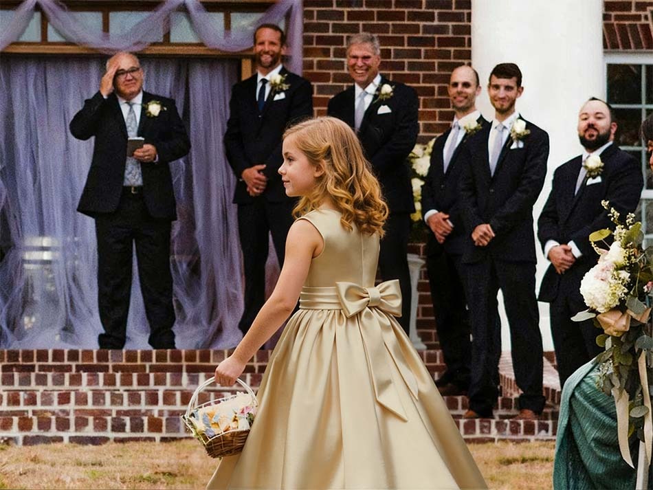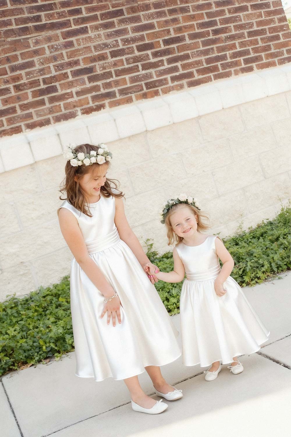 I bought two of these for my twin daughters who are flower girls in my sister's garden wedding. I was worried about the color consistency between the two dresses, but they matched perfectly. They look so cute standing together! The satin isn't too shiny, which I prefer—it has more of a soft glow. One of the dresses had a button that felt a little loose, so I reinforced it just in case, but otherwise, everything was fine. They are comfortable enough for the girls to run around in the grass during the reception.