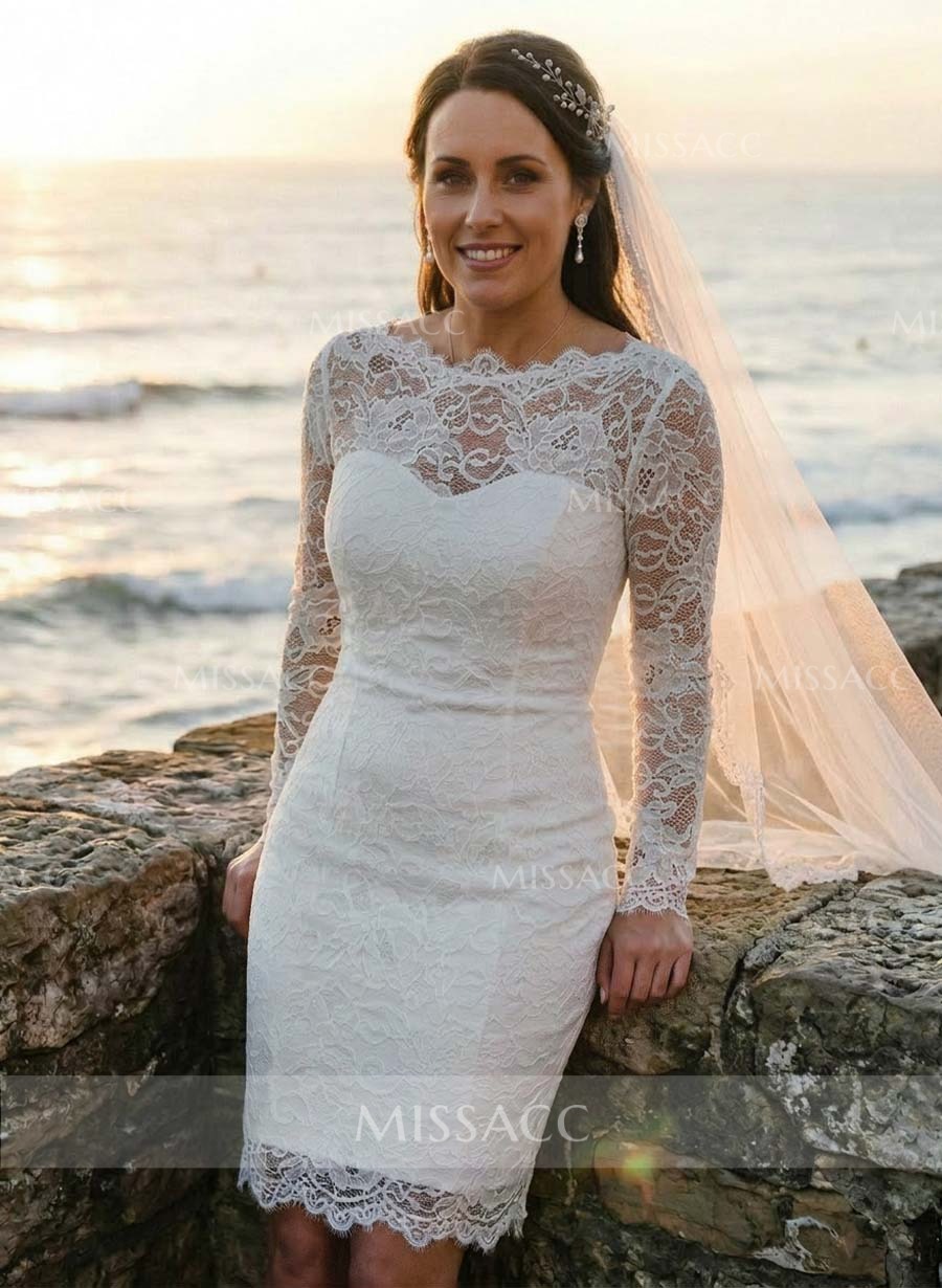 A-line lace wedding dress with square neckline and split-front design, perfect for a chic, modern ceremony.