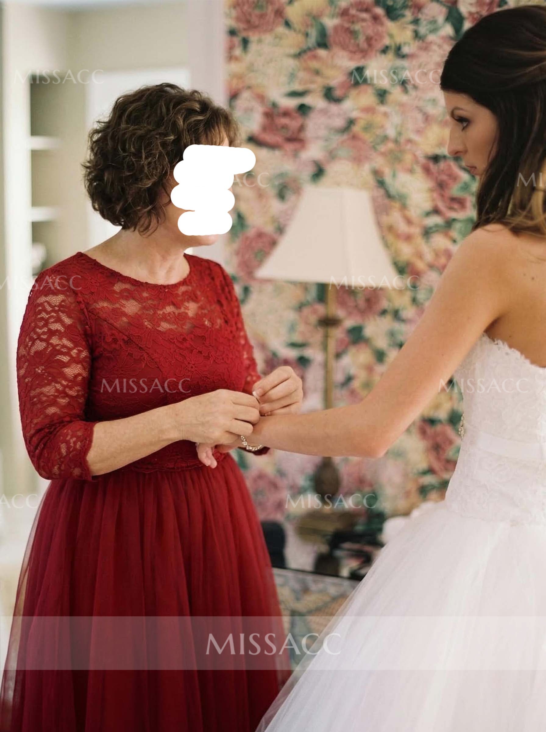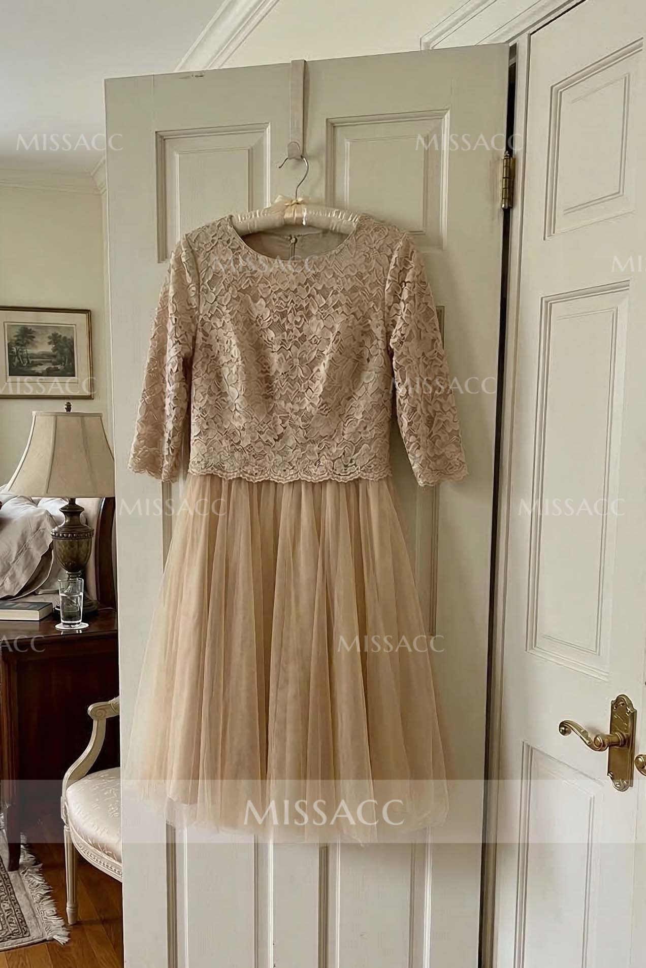 Crafted from a luxurious tulle fabric, this gown's light and airy texture adds a touch of elegance to any occasion. The round neckline and seven-quarter sleeve design create a flattering silhouette, while the lace detailing adds classic, timeless charm.