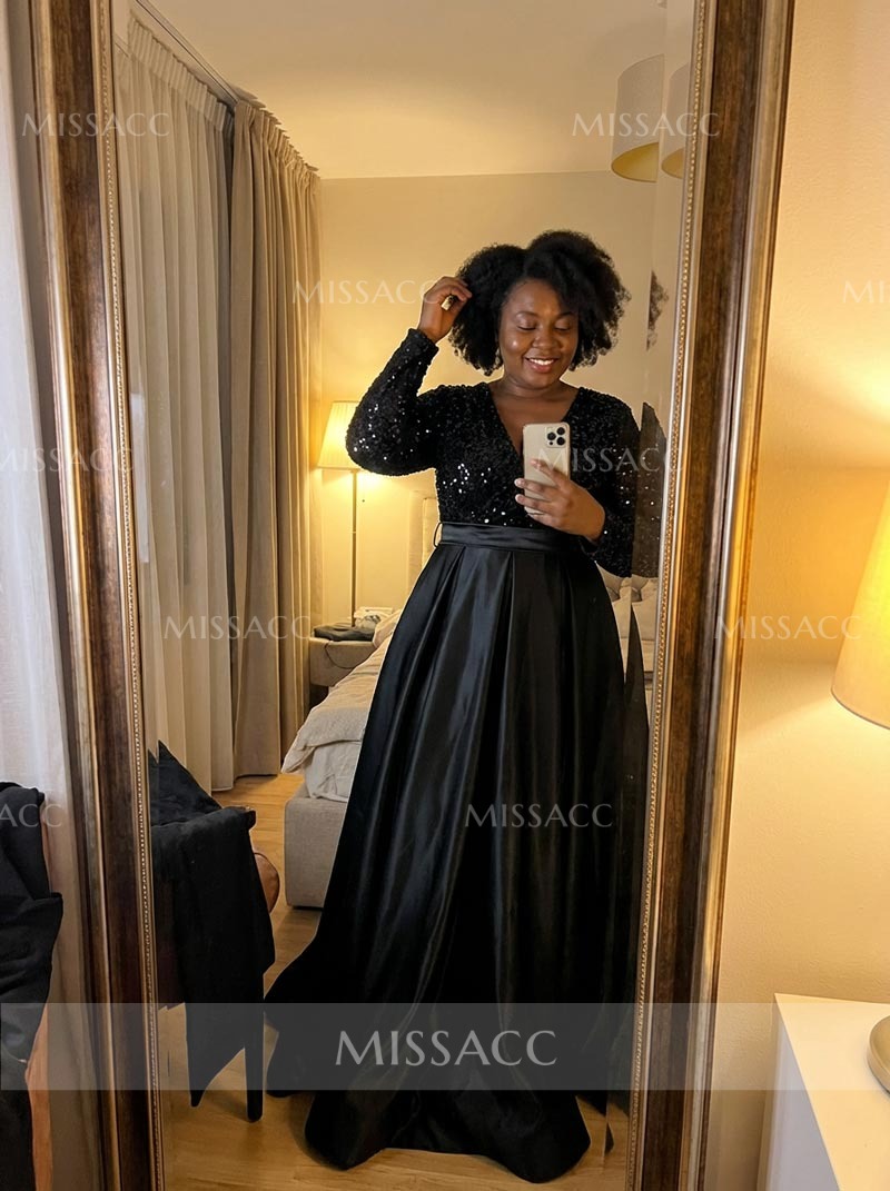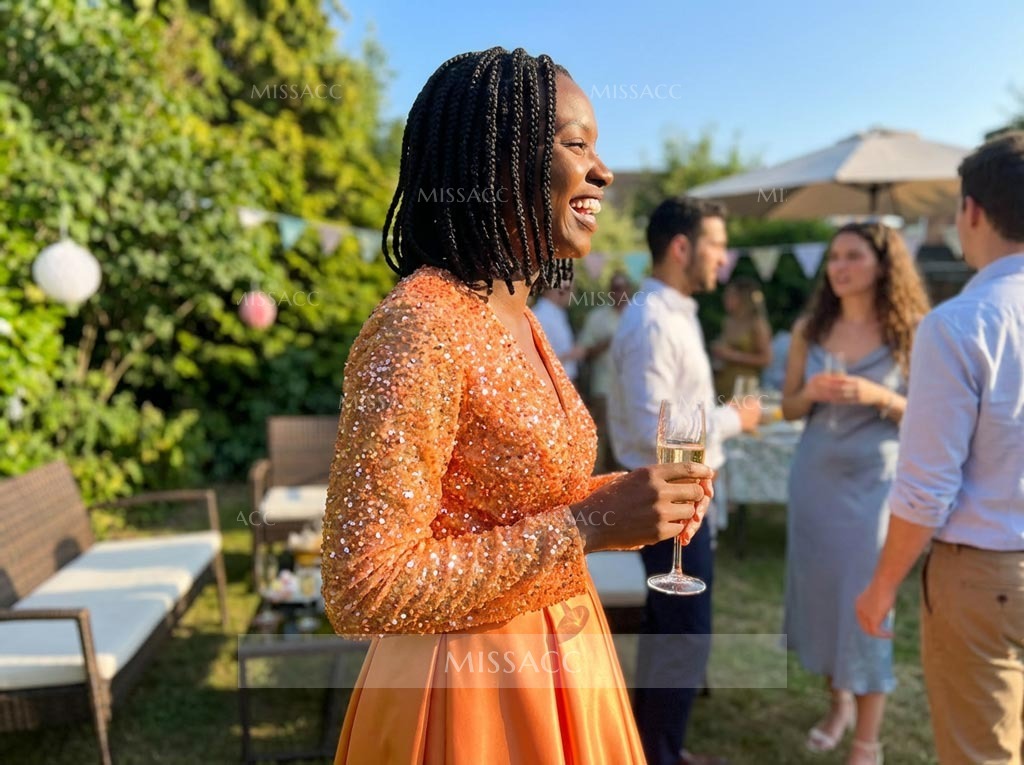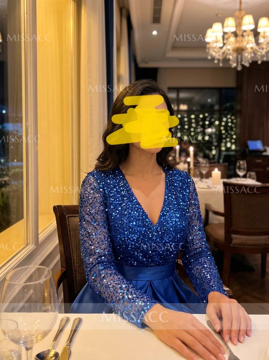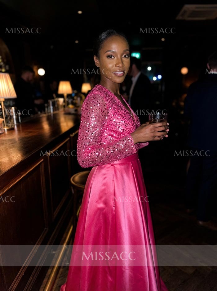 Discover our A-line V-neck Satin Sequined Evening Dress, featuring a flattering pleated design for a sophisticated look perfect for special occasions. Luxurious satin material with sequin accents for a touch of glamour.