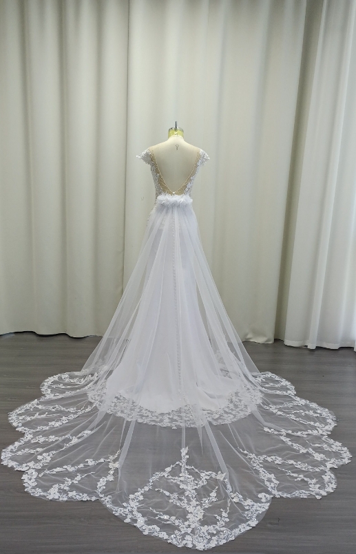Elegant Lace Illusion Neck Open Back Royal Chiffon/Tulle Wedding Dresses With Flower(s) #SWD12753