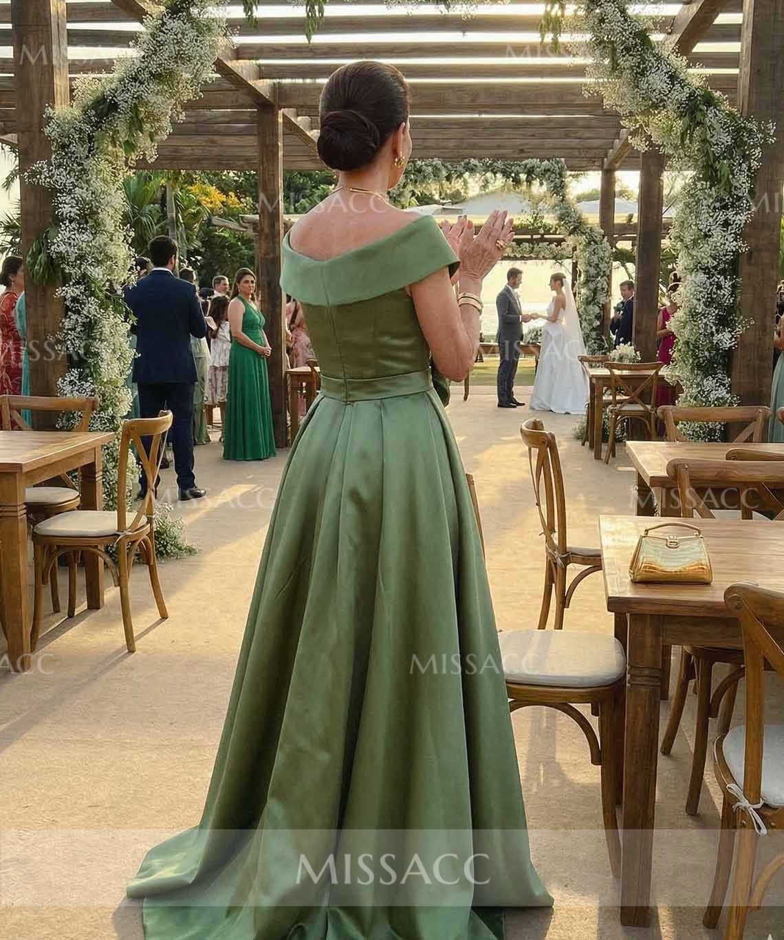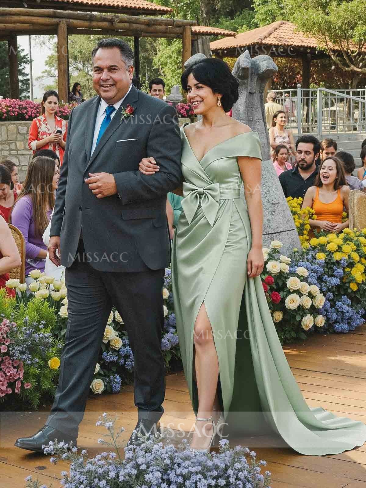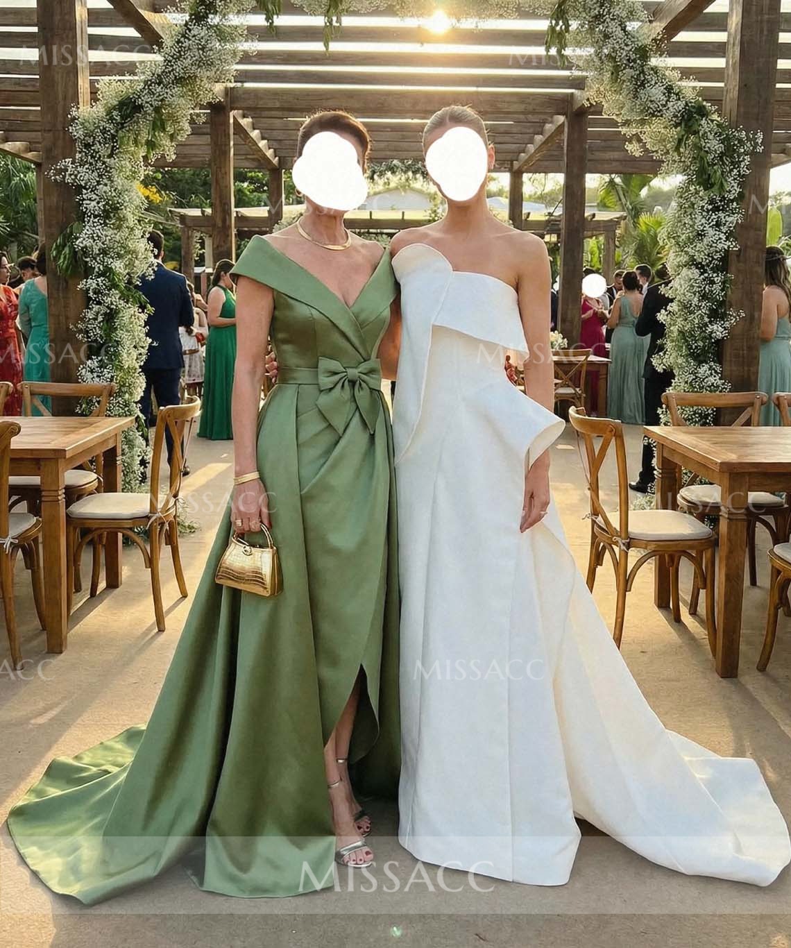 Stunning off-the-shoulder satin mother of the bride dress featuring a detachable bow and sleek sleeveless design. This floor-length gown offers a sophisticated silhouette perfect for weddings and formal evening parties. Shop this high-quality, stylish formal wear to shine on special occasions.