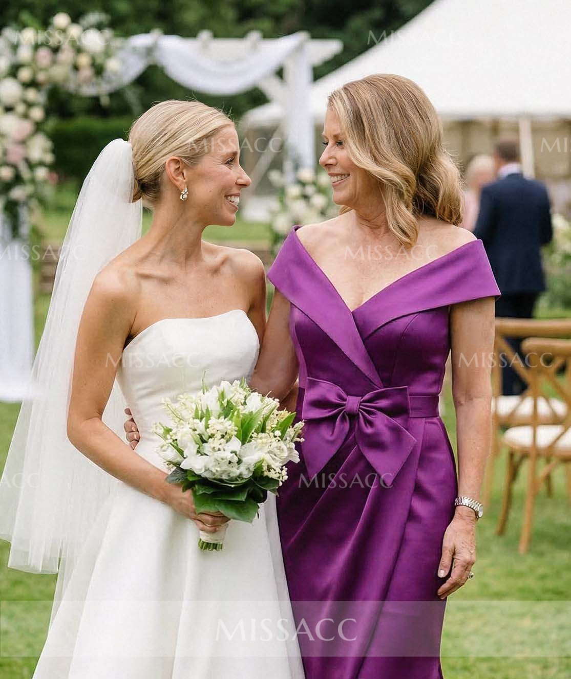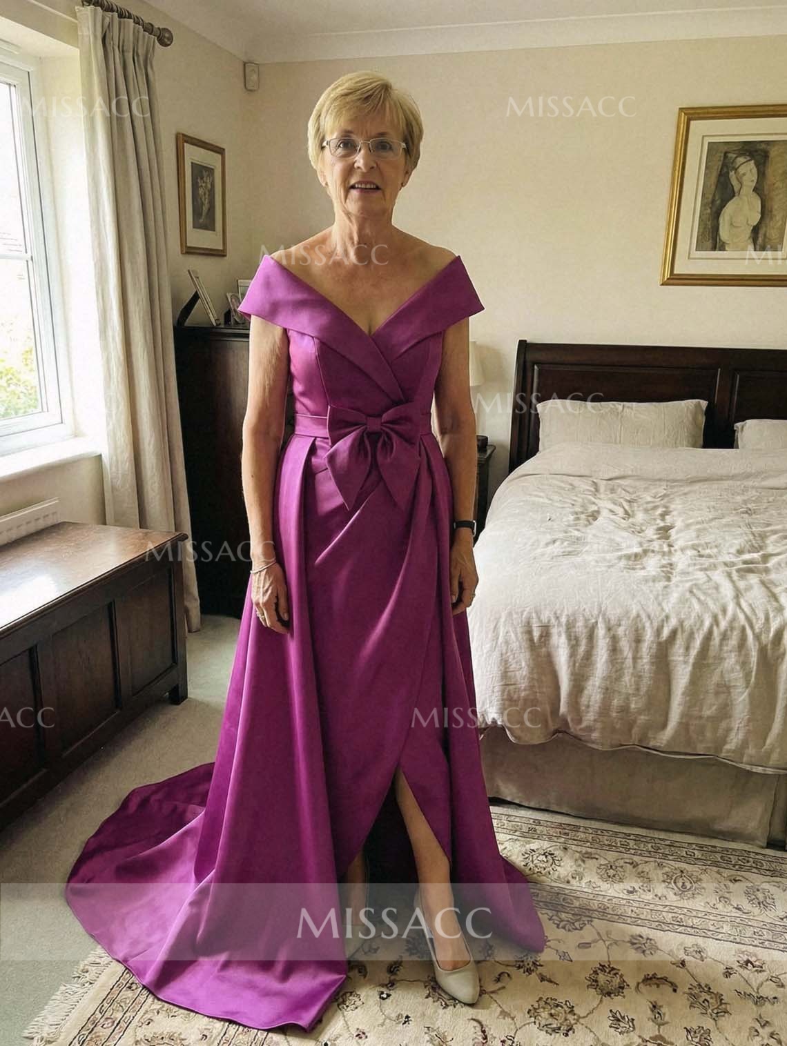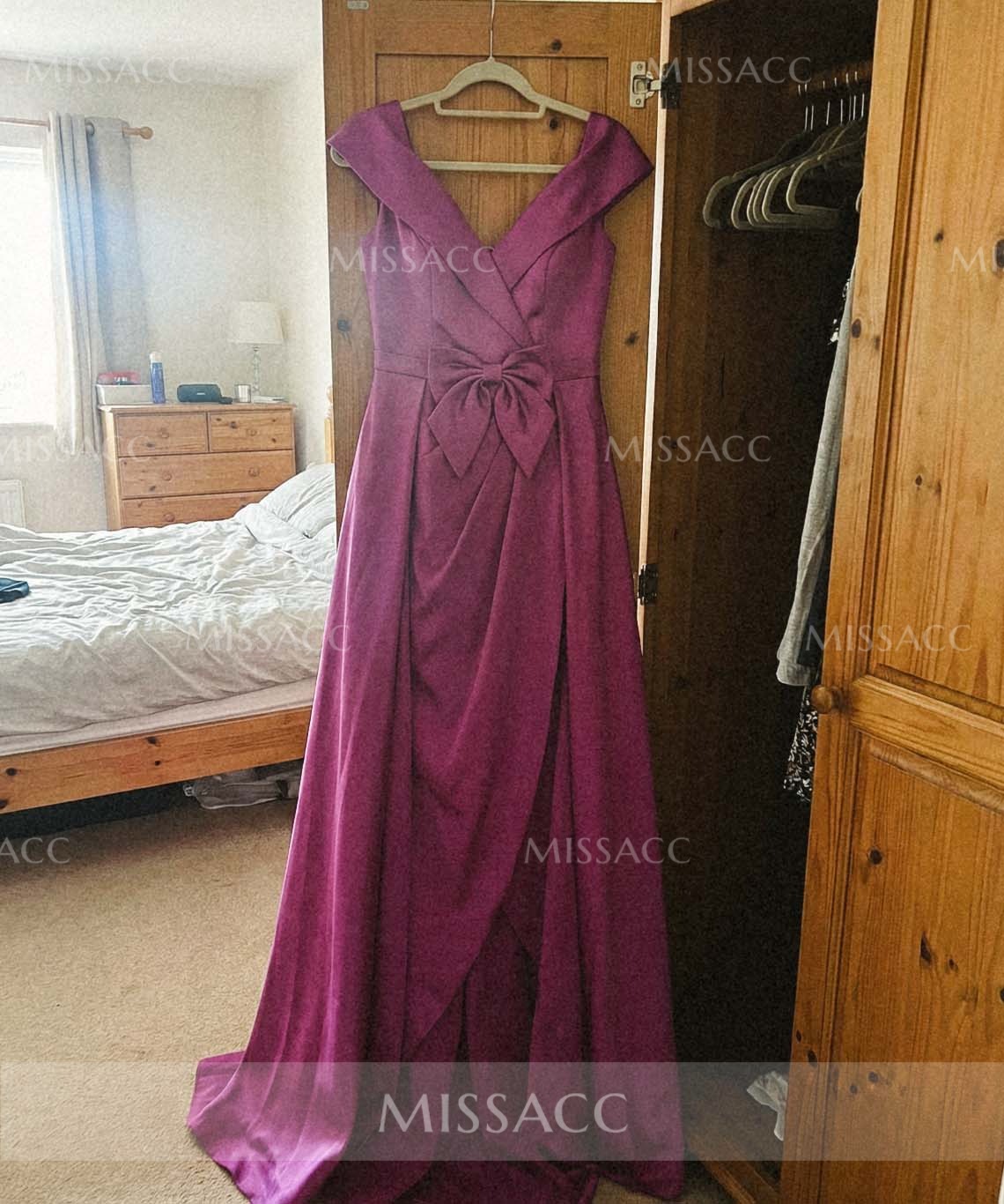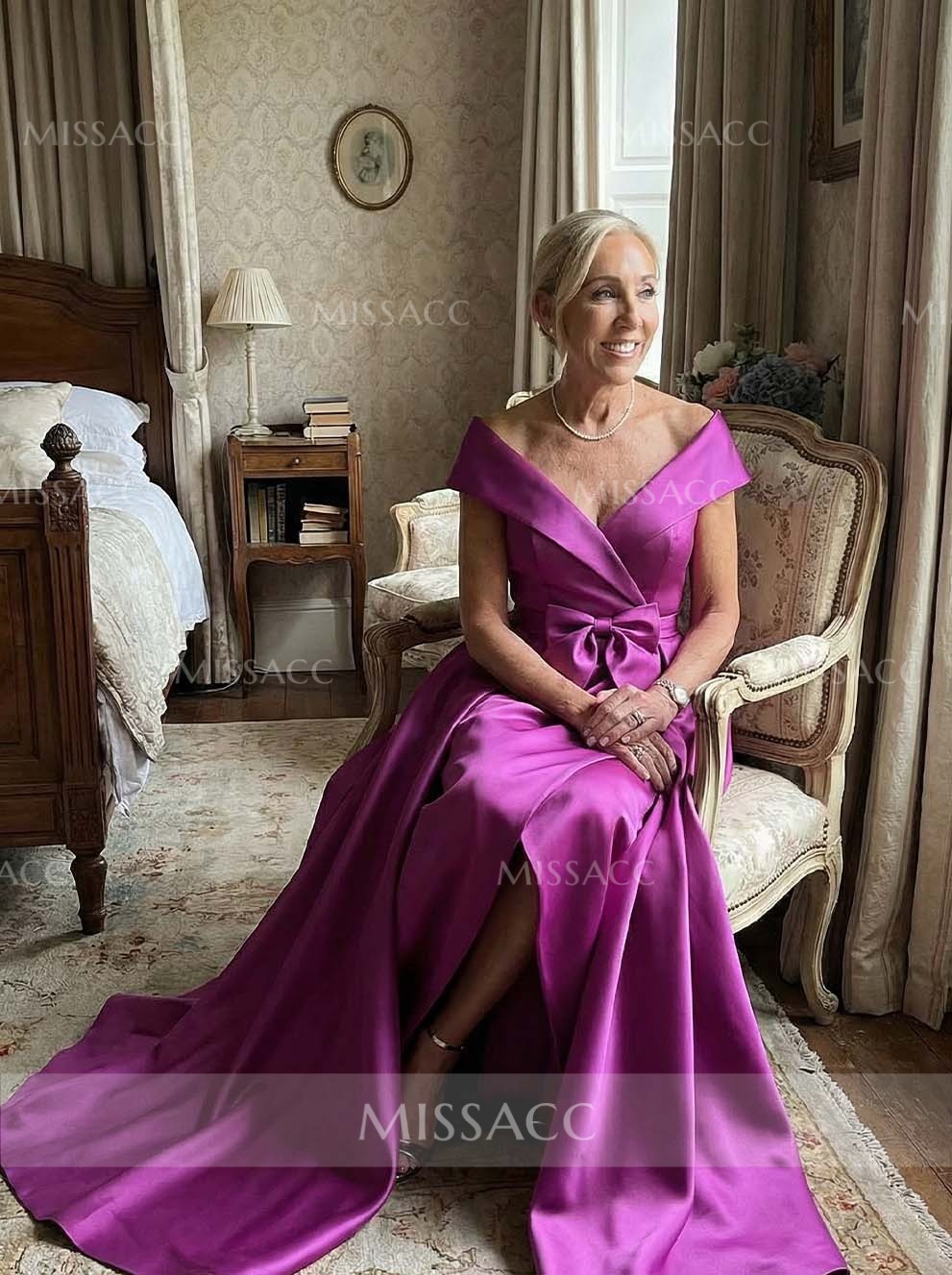 Stunning off-the-shoulder satin mother of the bride dress featuring a detachable bow and sleek sleeveless design. This floor-length gown offers a sophisticated silhouette perfect for weddings and formal evening parties. Shop this high-quality, stylish formal wear to shine on special occasions.