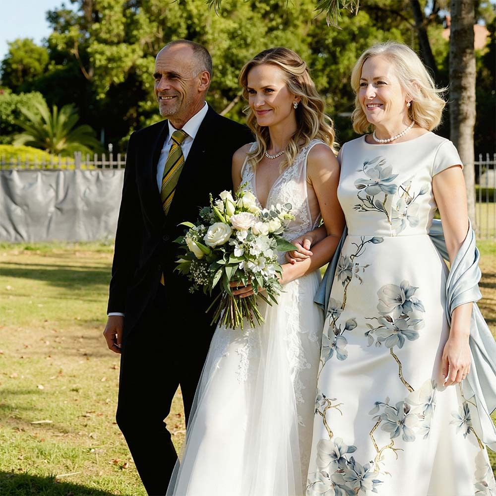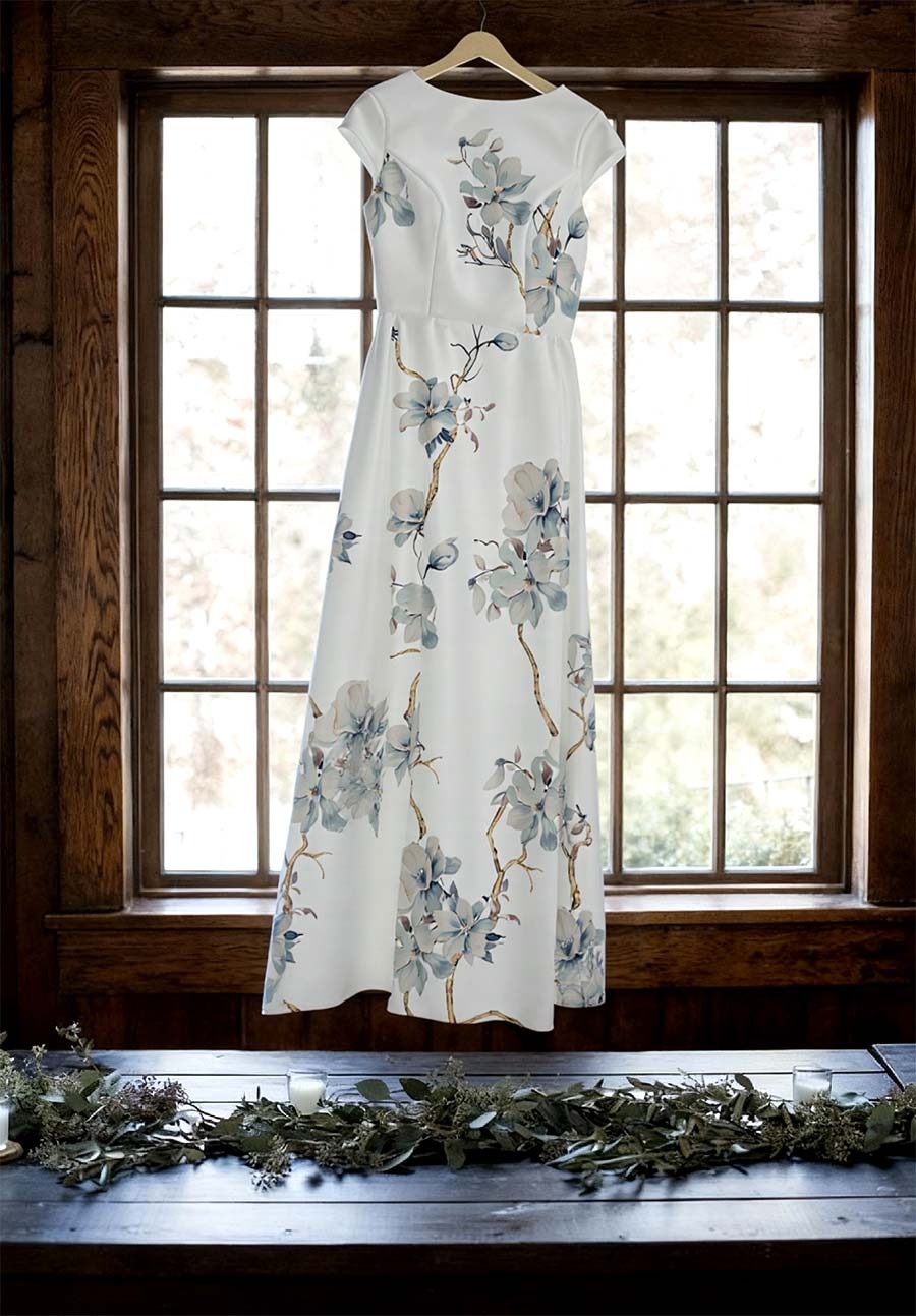Choosing this dress for my daughter's wedding was the best decision! As the Mother of the Bride, I wanted something elegant, comfortable, and distinctly special without overshadowing the bride. This gown was absolutely perfect. The silky fabric feels luxurious, and the light ivory background with the soft blue and gray floral print is simply breathtaking—it was ideal for our outdoor, garden ceremony. The cap sleeves and boat/scoop neckline are classic and flattering. It looks sophisticated and photographs beautifully in the natural light. I received so many compliments on how graceful the print was, and I felt confident and beautiful walking down the aisle with my husband and daughter. A truly exquisite and memorable dress for a special day.
