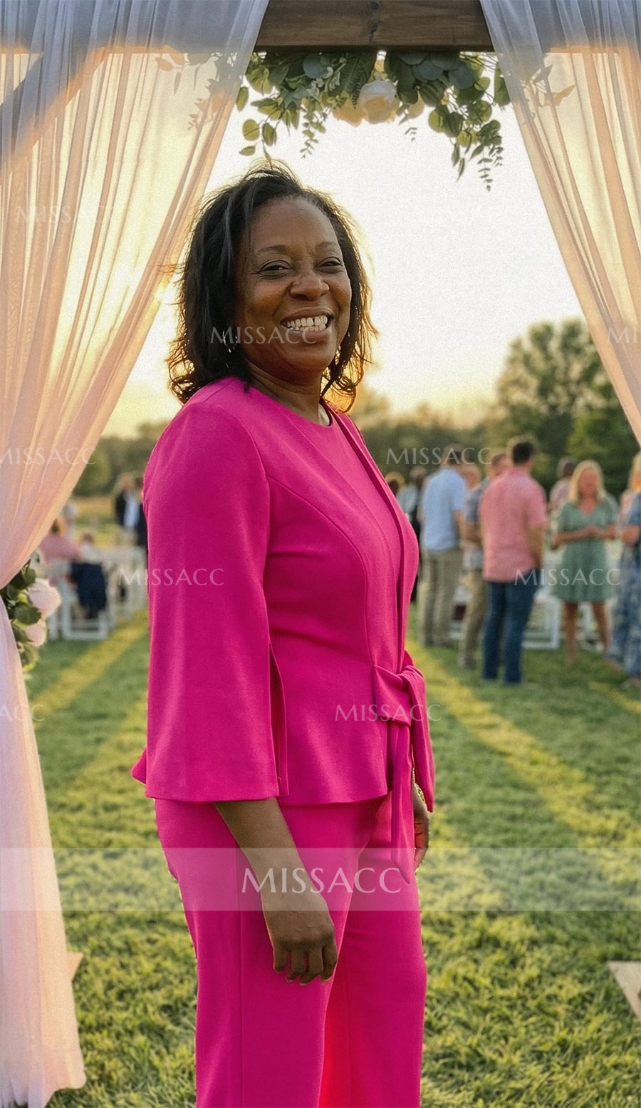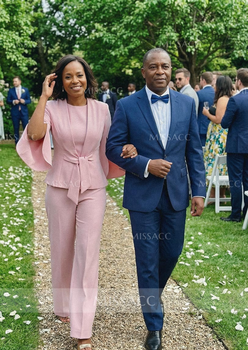 I recently purchased the jumpsuit and I'm pretty happy with it. The material is nice and the elastic satin gives it a touch of elegance. The mother-of-the-bride dress is a bit loose around the waist, but a simple belt should fix that. Overall, a good buy for the price.