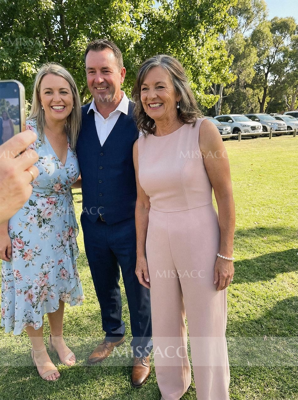Luxurious Elastic Satin jumpsuit with a scoop neckline, perfect for a chic mother-of-the-bride look. Elastic waist for comfort, ideal for wedding celebrations.
