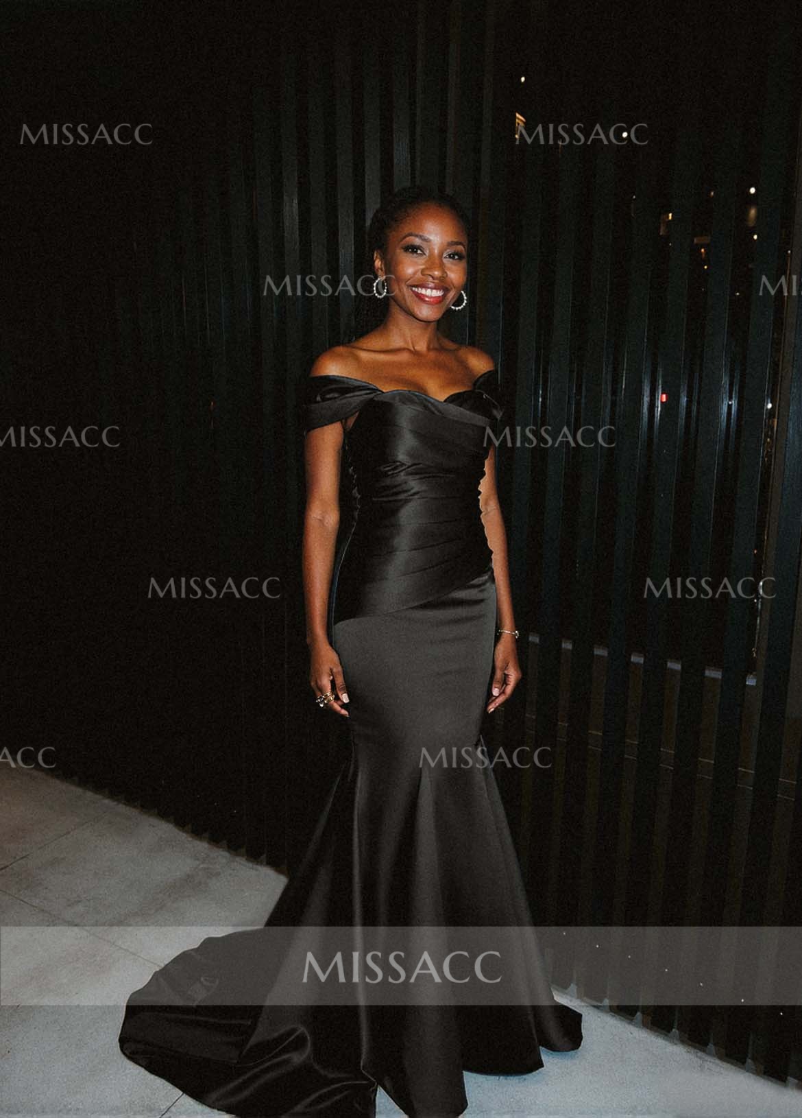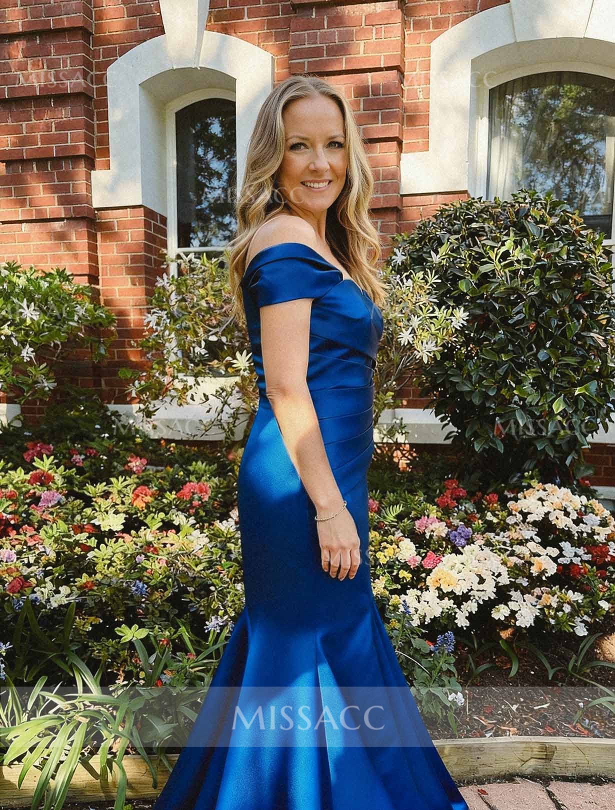 The off-the-shoulder neckline on this dress is perfectly constructed! It doesn't slip down, and the small cap sleeves are super flattering on the arms. The back view is just as striking as the front—the hidden zipper is well-concealed, and the way the Satin is shaped gives a beautiful, clean line down the spine to the train. Paired with a delicate necklace and drop earrings, this look screams classic Hollywood. It's truly a beautiful, high-impact design that shows off the shoulders and back gorgeously