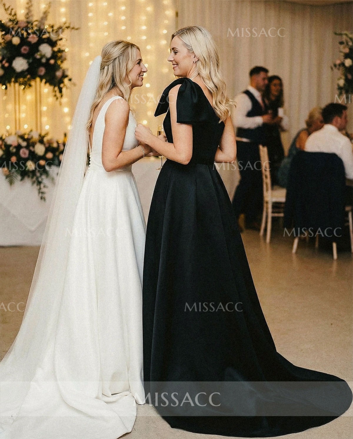 The elegance of this dress is unmatched. The off-shoulder design and bow detail adds a chic touch. Oh, and the sweep train? Absolutely stunning!