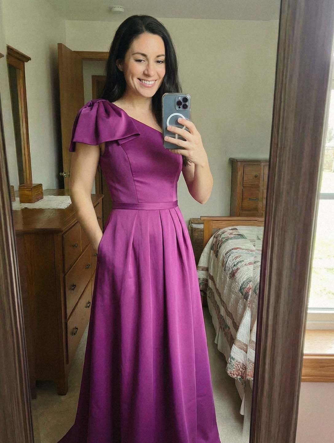 This dress is absolutely gorgeous! The craftsmanship is impeccable, and it fits like a dream. The one-shoulder design and bow accent add such a unique flair. I wore it to a formal event and turned so many heads and received tons of compliments. I can't recommend it highly enough!