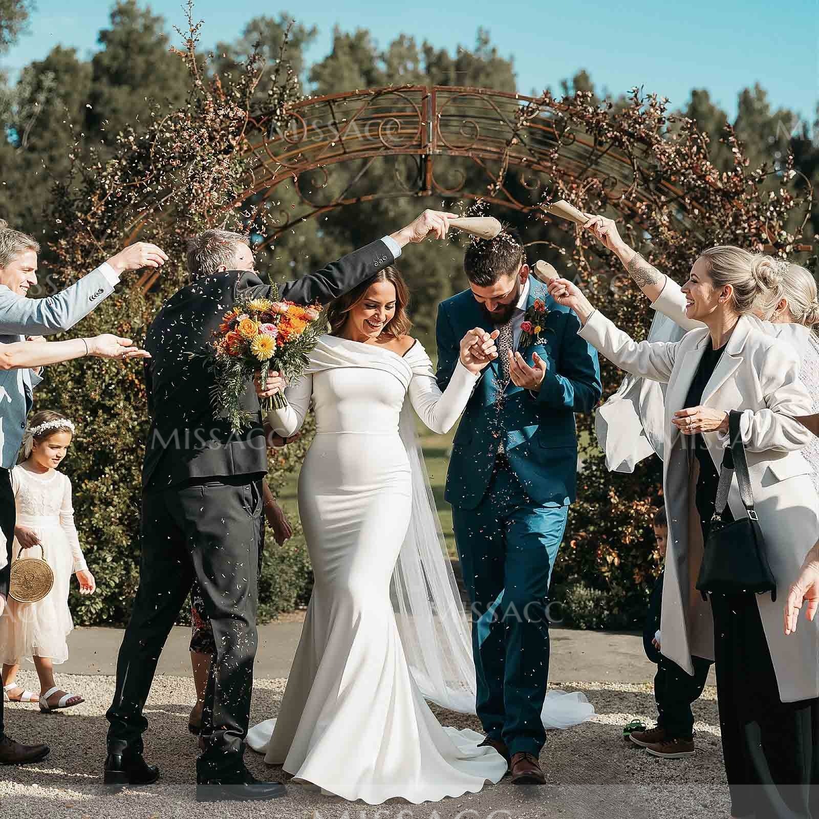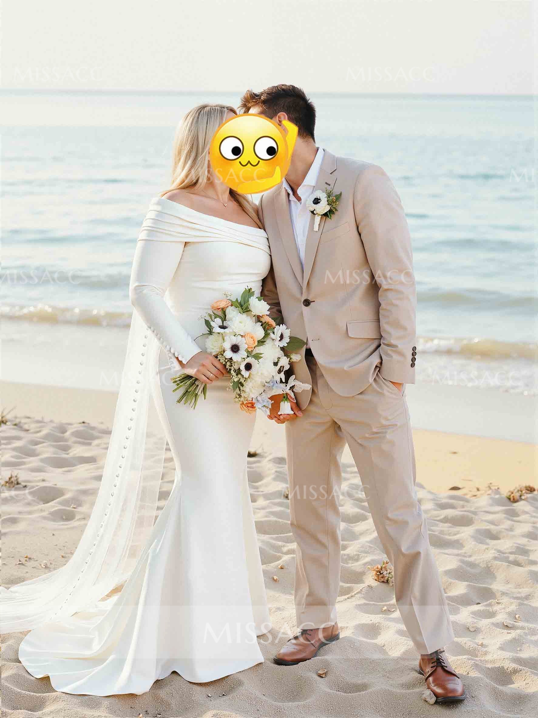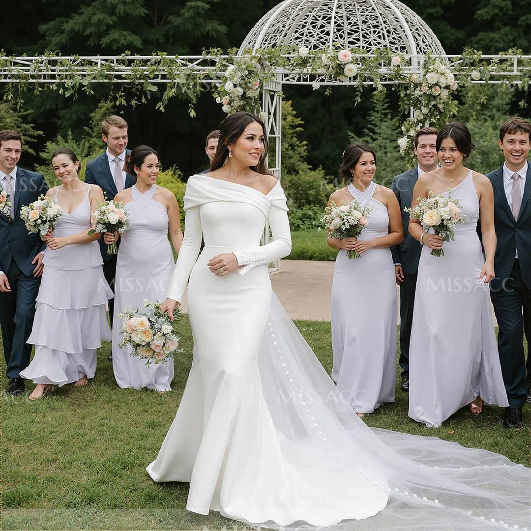 I’m so excited about this dress! I was looking for something classic but with a unique detail, and this delivered. The satin is absolutely gorgeous, it shimmers without being too flashy. The sheath style is so flattering, and the asymmetrical long sleeves add a sophisticated edge. It feels very well-made, and I can already tell it’s going to be comfortable to wear throughout the wedding. This is definitely a winner in my book.