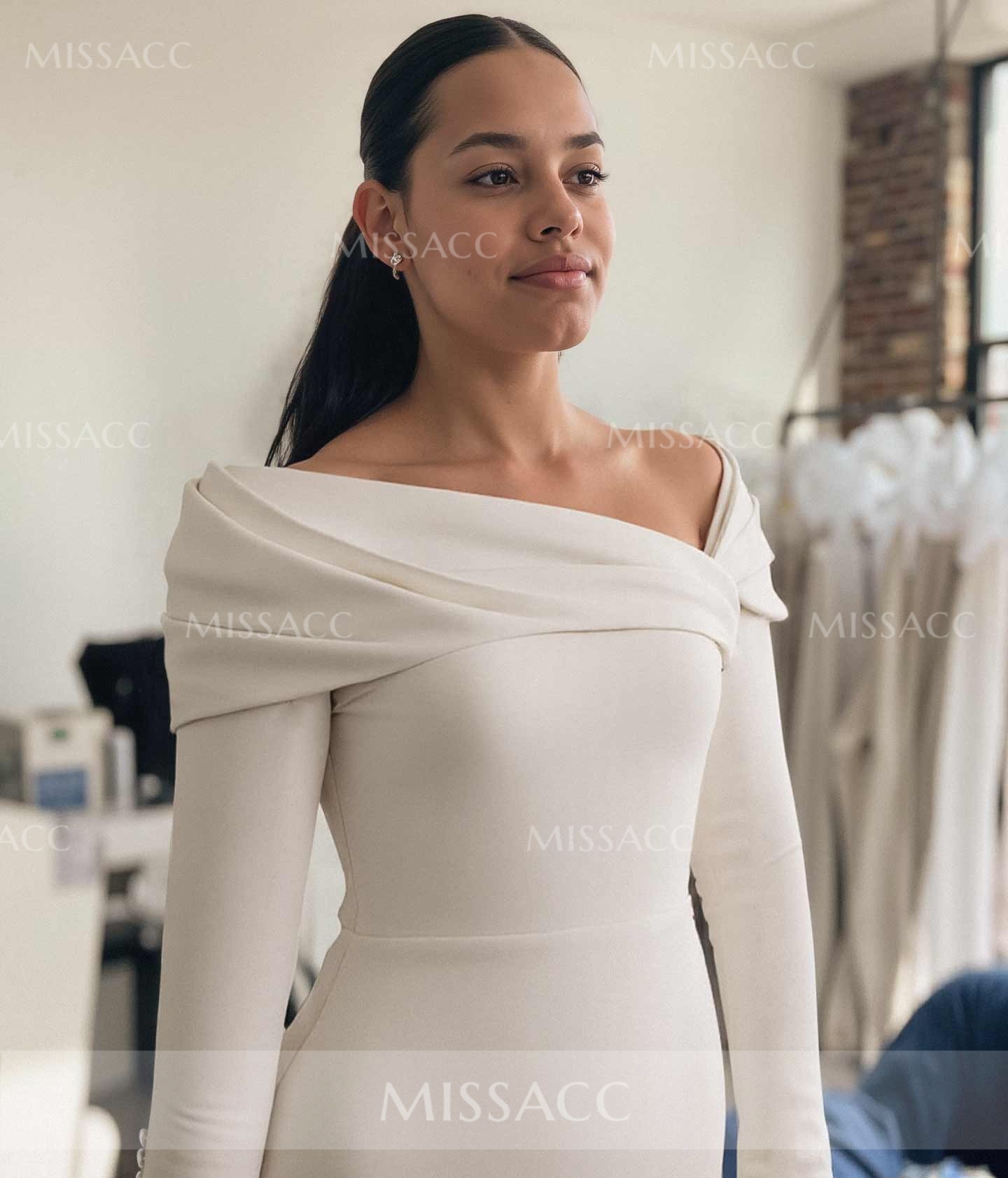 Intricate satin sheath column wedding dress with asymmetrical long sleeves, designed for a chic and modern bridal look. Perfect for a sophisticated ceremony.