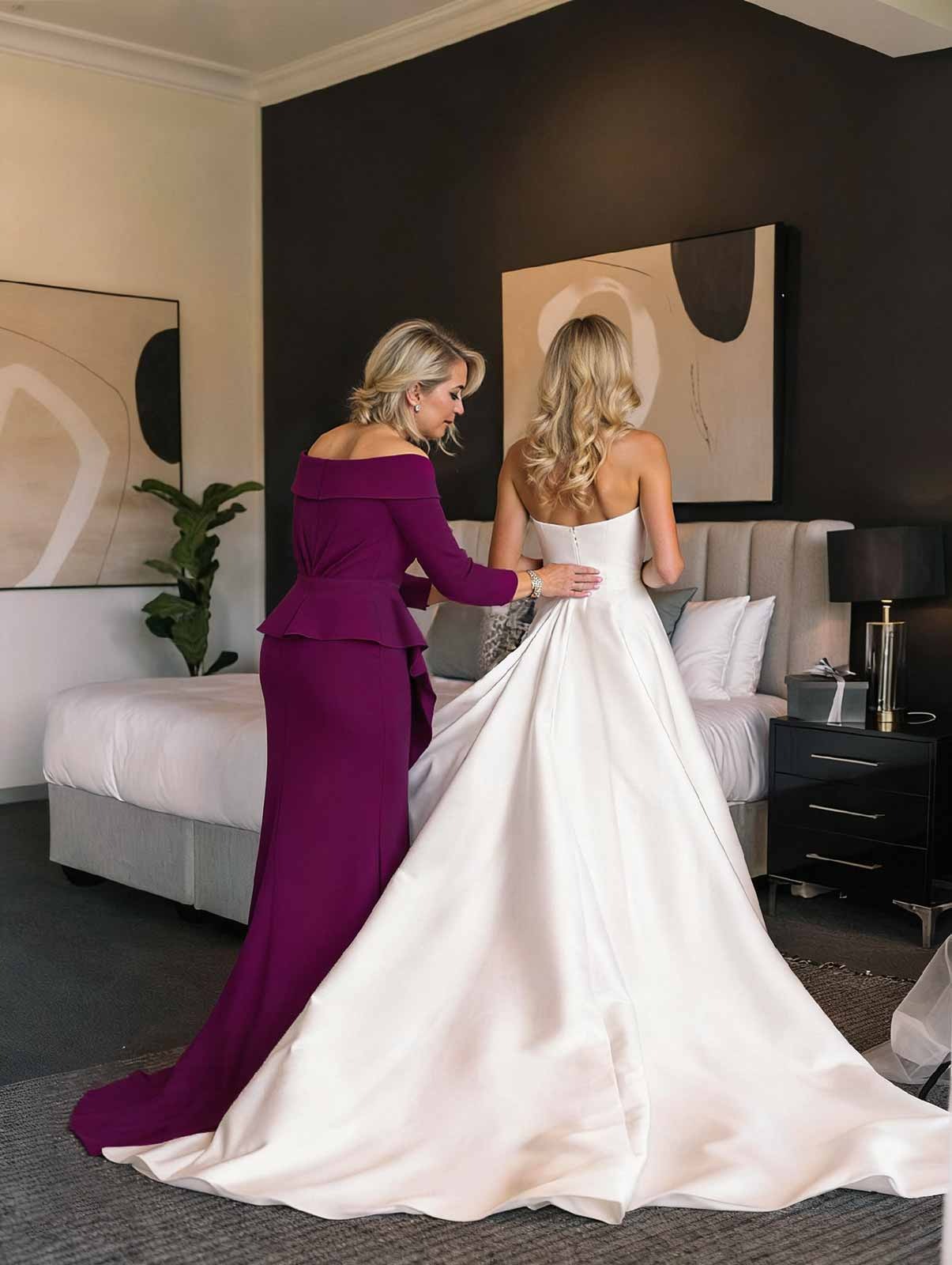 Crafted from luxurious satin, this gown is designed with a stretch silhouette that not only flatters the figure but also adds a touch of elegance to any occasion. Delicate floral detailing accentuates the cylindrical silhouette and completes the gown. Ideal for weddings or formal gatherings, this mother of the bride gown is designed to make a fashion statement.