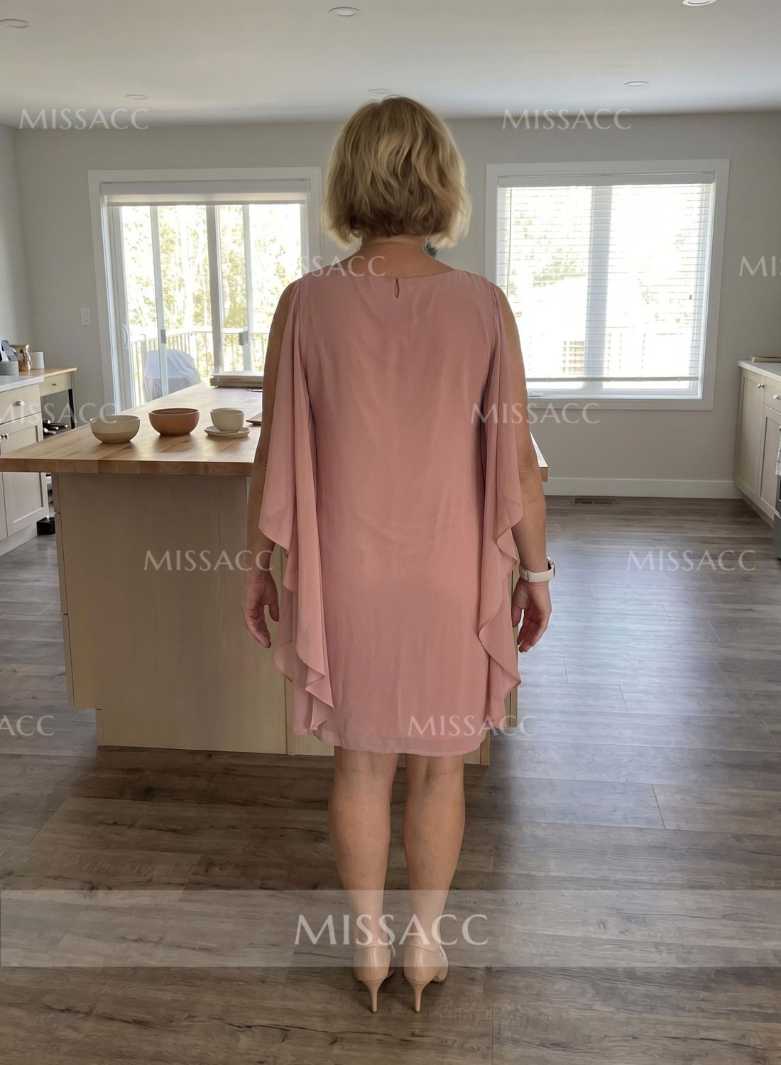 I wanted to show what the back looks like, since that was my biggest concern. The overlay cape is awesome! It completely covers the upper arms while still looking incredibly elegant and modern. The knee-length cut is perfect for my height. The zipper works flawlessly and the stitching is impeccable.