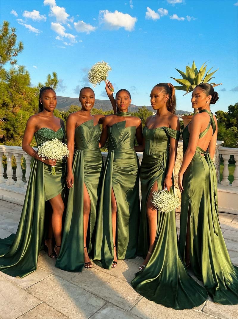 Sheath Column Satin Bridesmaid Dresses with High Split, perfect for weddings and formal events, featuring a sweeping train and elegant satin fabric for a sophisticated look.