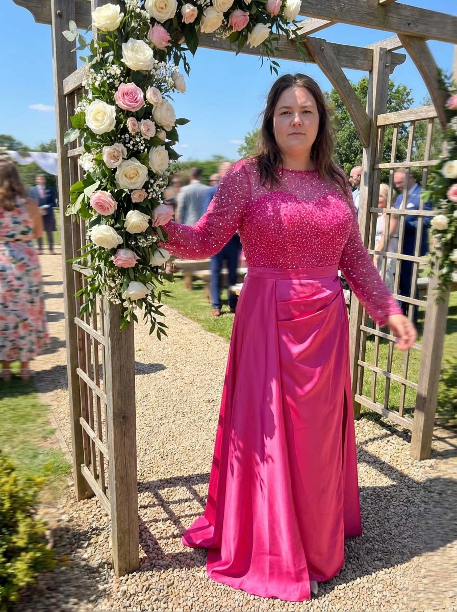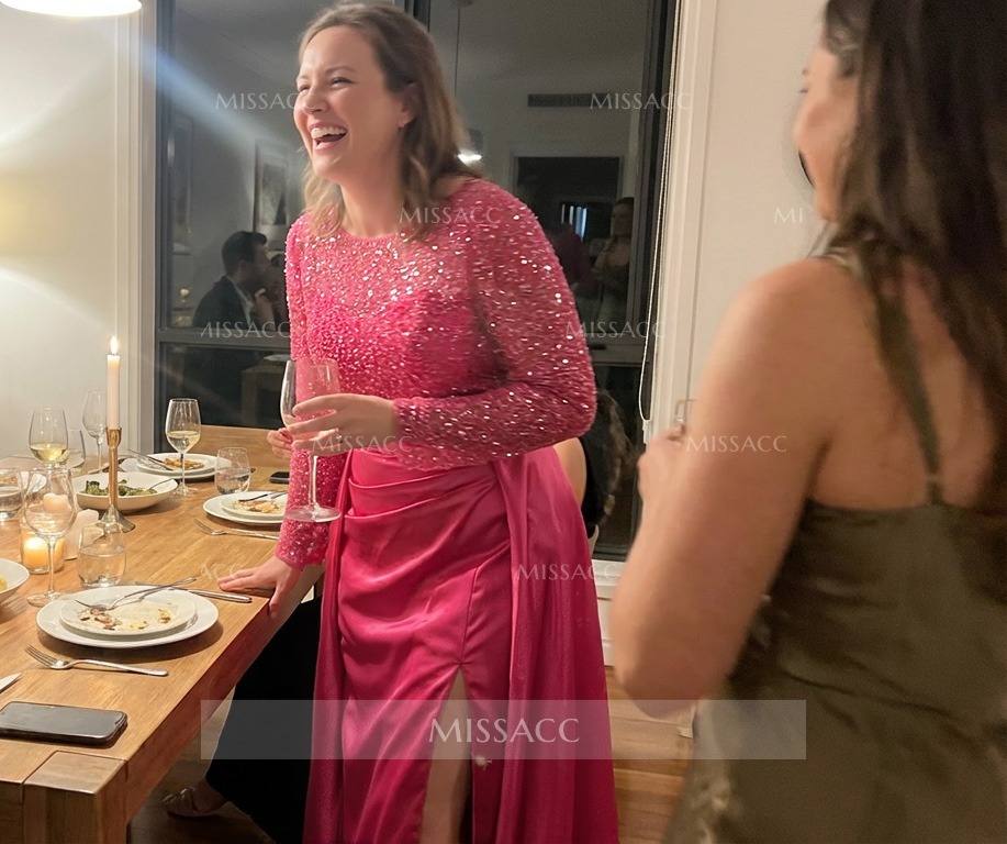 I'm usually skeptical about online shopping, but this dress is a game changer! The match of long sparkly sleeves and satin dress is stunning, making me feel like I'm the most beautiful woman in the room.