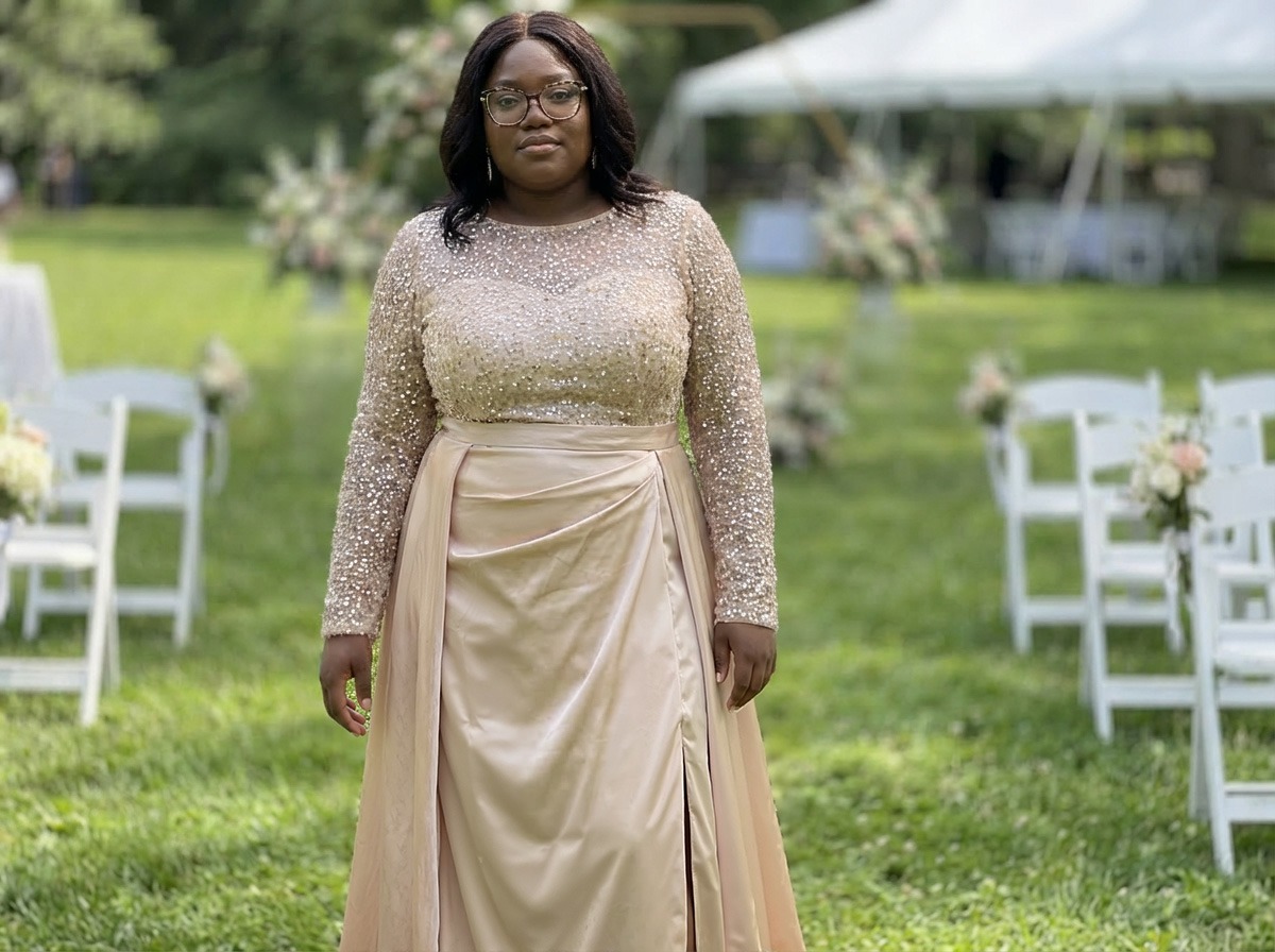 This dress is much prettier in person than in the pictures. The sparkly sleeves and satin fabric adds a touch of elegance and sophistication. It is a perfect choice for any fancy event.