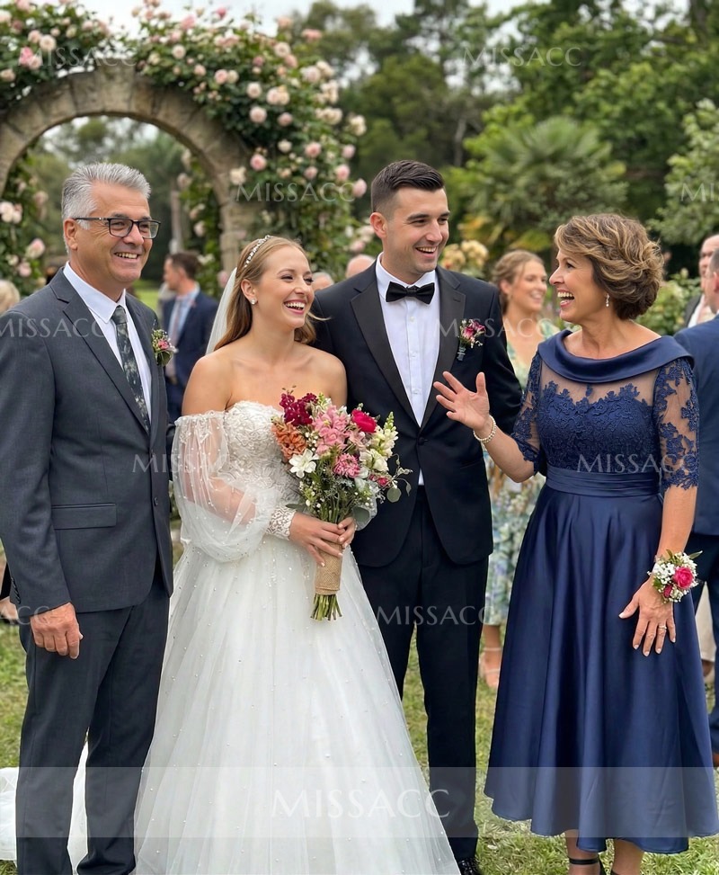 Stunning mermaid satin mother of the bride dress with lace and rhinestone appliques, perfect for a glamorous wedding event.