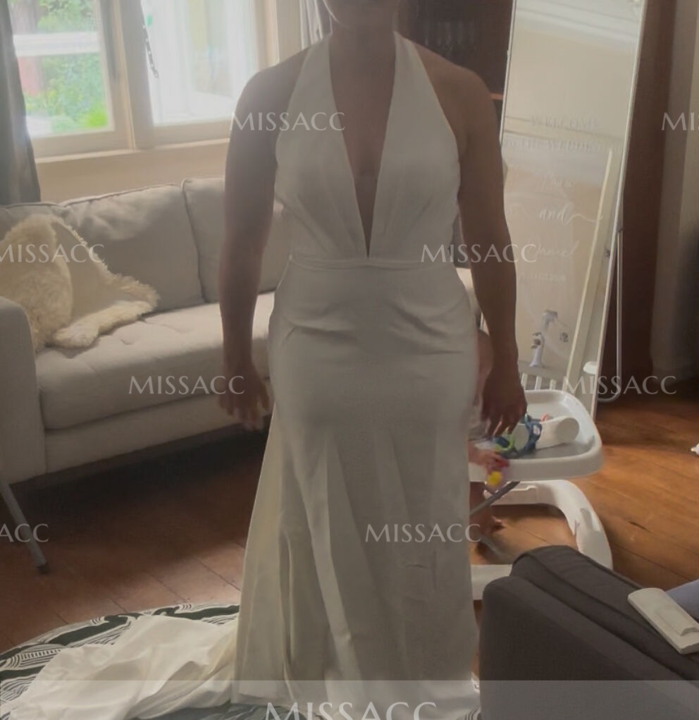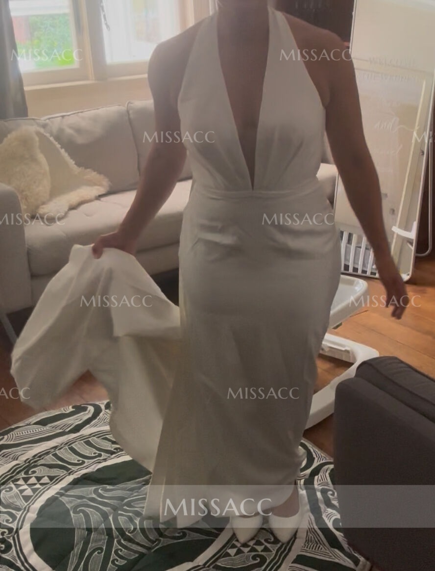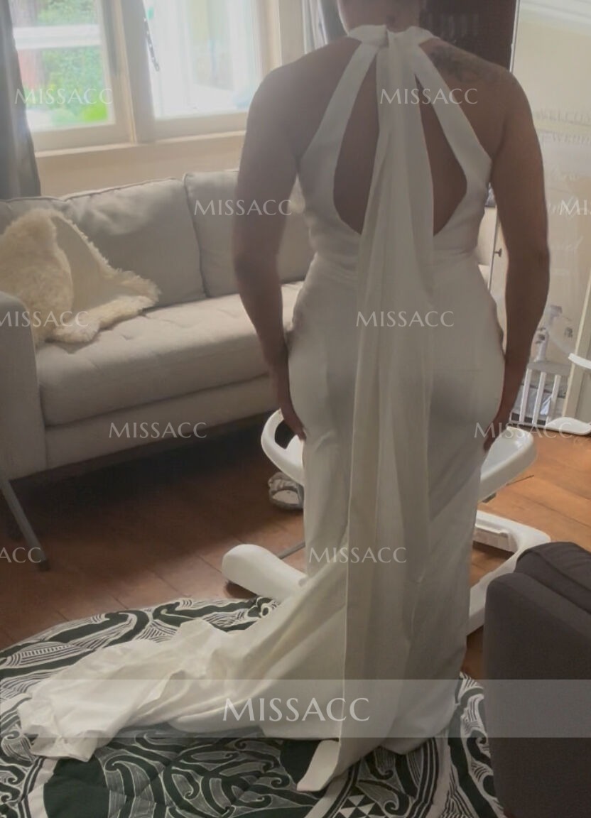 Elegant mermaid silhouette wedding dress in satin with a halter neckline, featuring a sleeveless design and elastic waist for a perfect fit, ideal for a romantic ceremony.