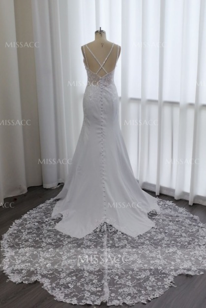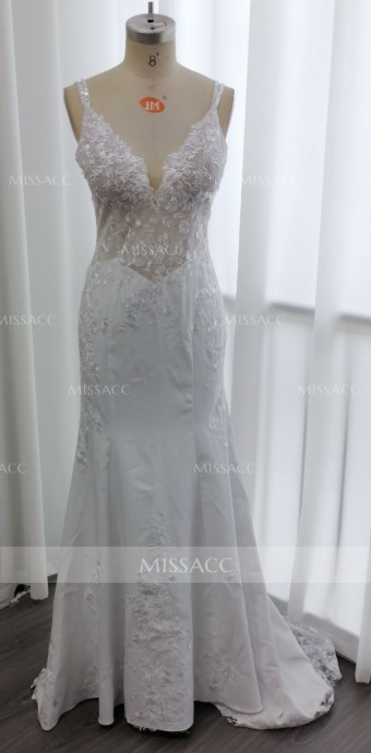 Stunning mermaid v-neck wedding dress with lace appliques, crafted from premium materials for a perfect fit and a memorable event. Ideal for weddings and formal gatherings.